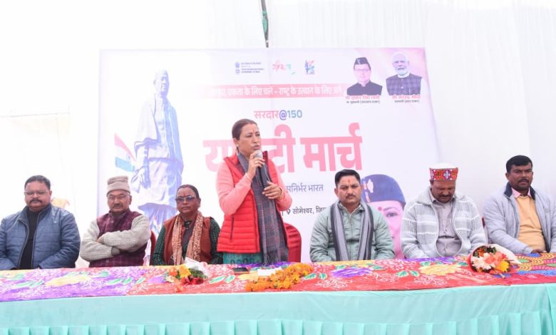 सोमेश्वर। लोह पुरुष सरदार वल्लभभाई पटेल की 150वीं जयंती के अवसर पर रविवार को सोमेश्वर में ‘रन फॉर यूनिटी’ पैदल यात्रा का आयोजन किया गया। कैबिनेट मंत्री रेखा आर्या अपने निजी आवास से शहीद स्मारक तक आयोजित इस यात्रा में सम्मिलित हुई। इस अवसर पर कैबिनेट मंत्री रेखा आर्या ने कहा कि सरदार वल्लभभाई पटेल ने देश को एक धागे में पिरोने का महान कार्य किया था। उन्होंने कहा कि हम राष्ट्र के प्रति अपने कर्तव्यों का निष्ठापूर्वक निर्वहन करते हुए ही सरदार पटेल को सच्ची श्रद्धांजलि दे सकते हैं।